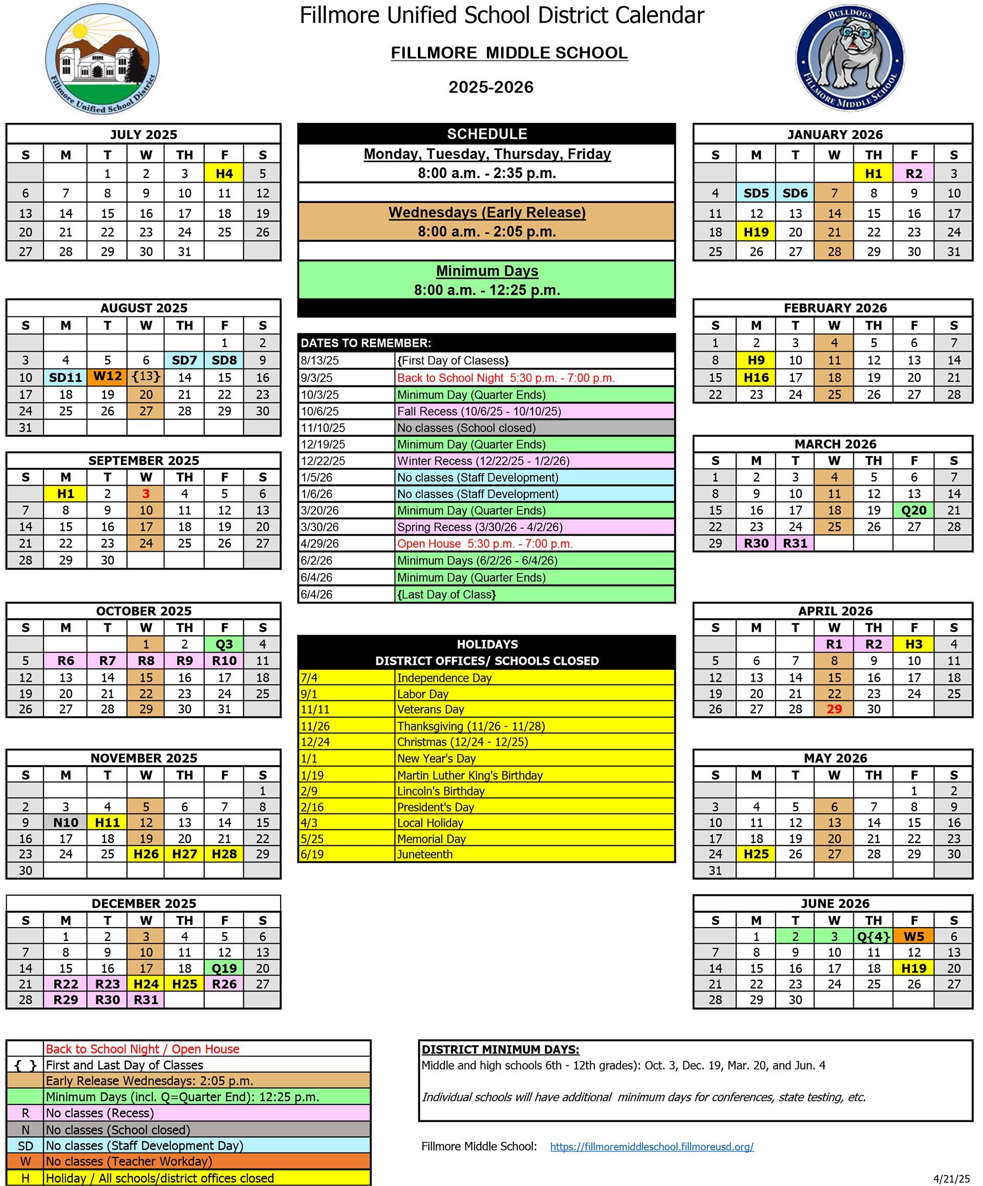 Fillmore Middle School Annual Calendar 2025-26 School Year - English
